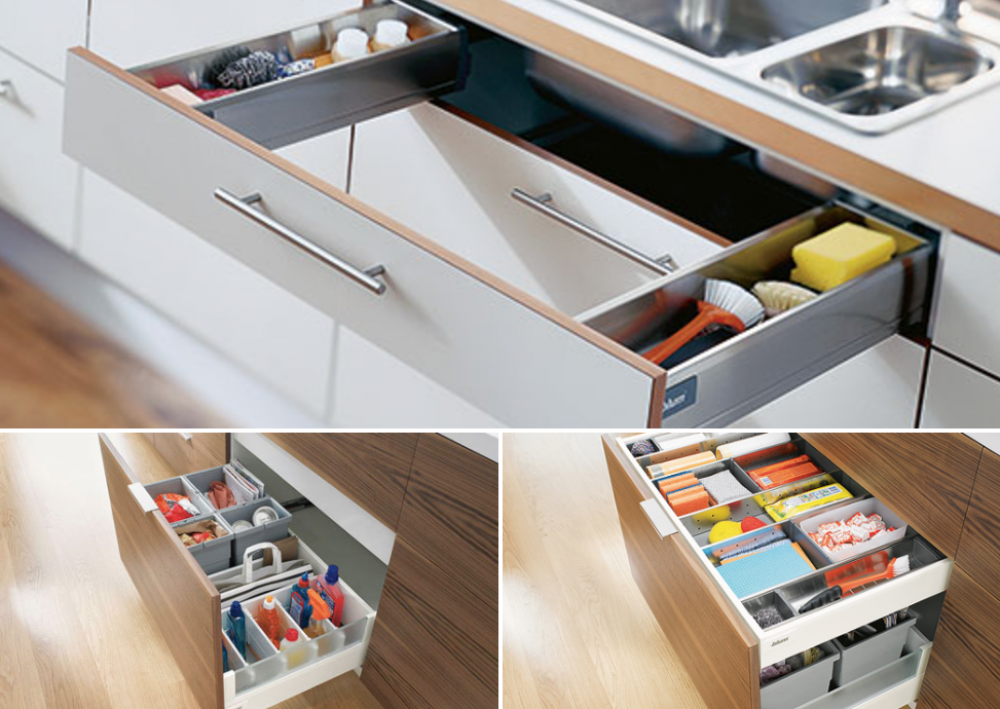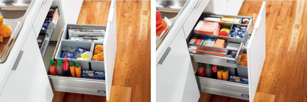 Egy jó háziasszony nem csak azzal törődik, hogy a konyhában látszólag minden a helyén legyen. A fiókokban is rendnek kell lenni. Ebben pompás segítséget nyújtanak a BLUM belső elválasztói. Az ORGA-LINE köztesfalakkal a tisztítószerek higiénikusan elválaszthatók a hulladékgyűjtőtől.